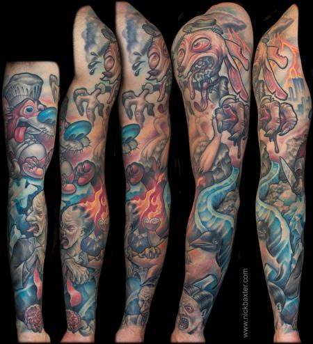 This bold colored T rex dinosaur tattoo was done by Canman in Albuquerque,NM on the thigh.